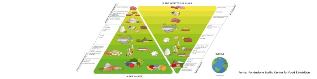 Negli ultimi anni è stata sviluppata un’altra piramide alimentare, pensata però non per le nostre esigenze alimentari e la nostra salute – almeno non in senso stretto – ma per raccontarci le esigenze del pianeta e gli effetti che la nostra alimentazione ha sugli ecosistemi nei quali viviamo. La piramide, in questo caso, è rovesciata: in basso troviamo gli alimenti che hanno un impatto minore sul pianeta e che quindi si considerano più sostenibili, mentre in alto ci sono quelli che, per essere prodotti, richiedono l’impiego di più risorse e l’emissione di più CO2.